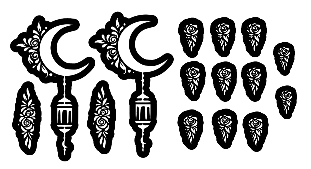 The Eid Moon Lantern Henna Stencil Set includes crescent moon designs with hanging lanterns, paired with coordinated floral finger motifs in multiple sizes. Created for flexible placement on the back of the hand and fingers, this set allows easy mixing and matching for balanced Eid and Ramadan henna looks. Bold, clean lines make it ideal for henna application and temporary tattoos.