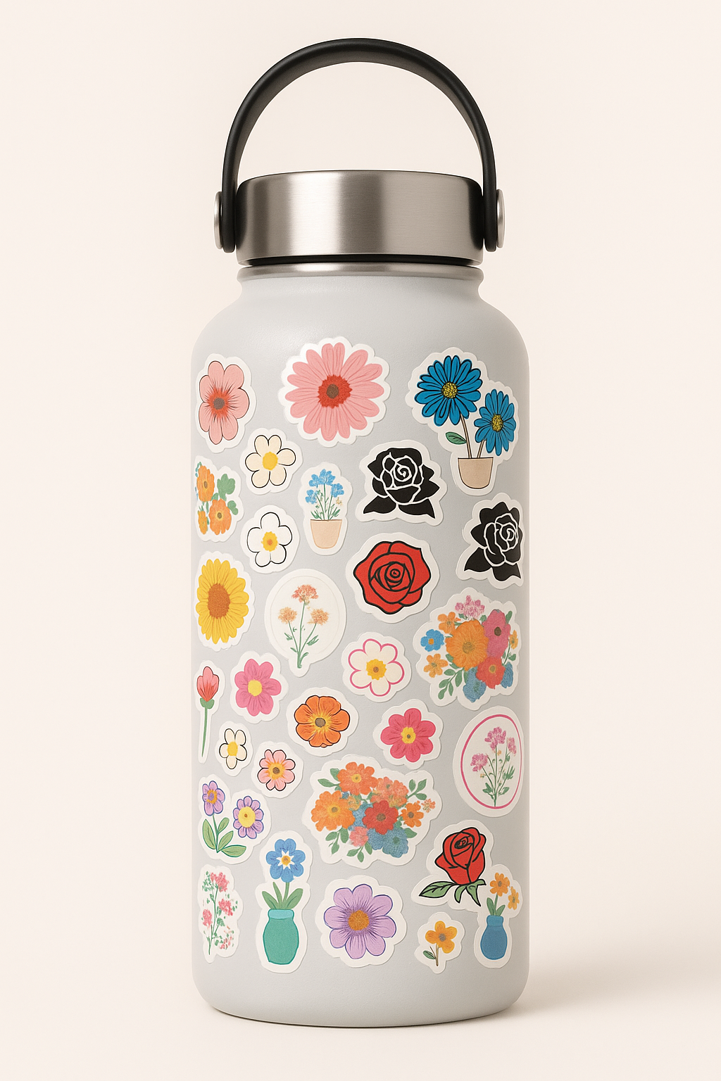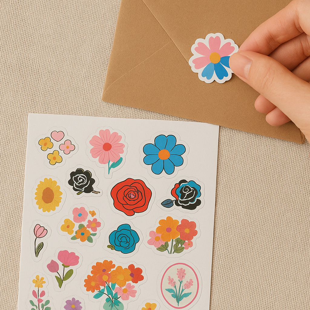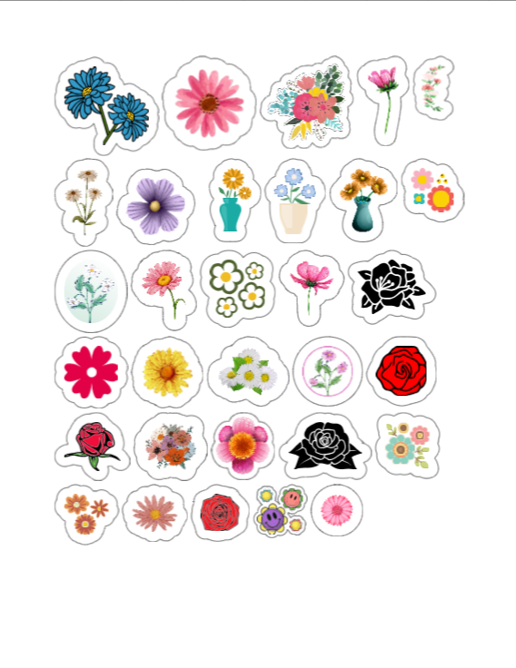 30 Flower Stickers on an A4 Sheet. This elegant collection features a variety of floral designs. Crafted on waterproof vinyl with a smooth finish, these peel-and-stick florals add a gentle, natural charm wherever they’re placed.