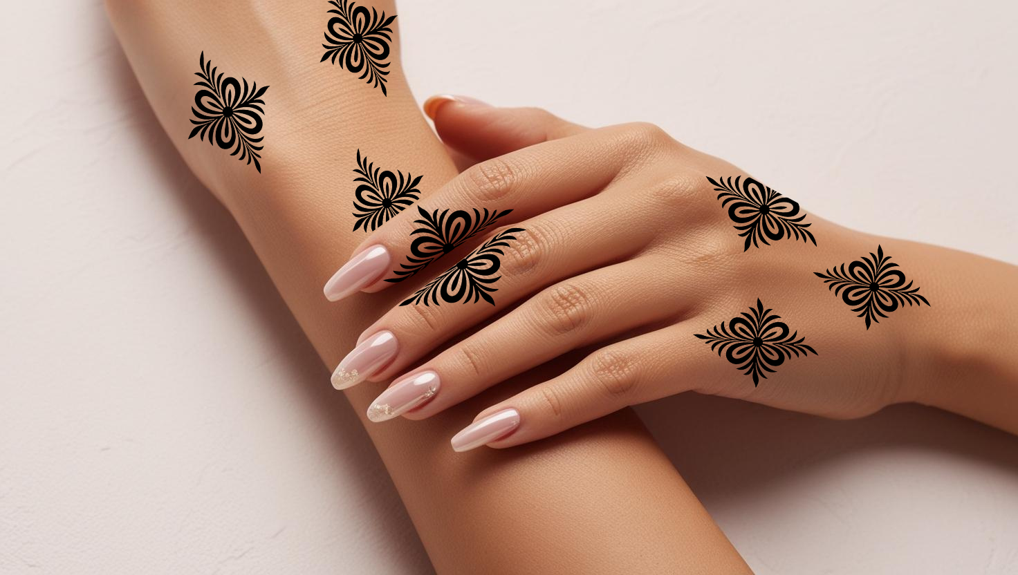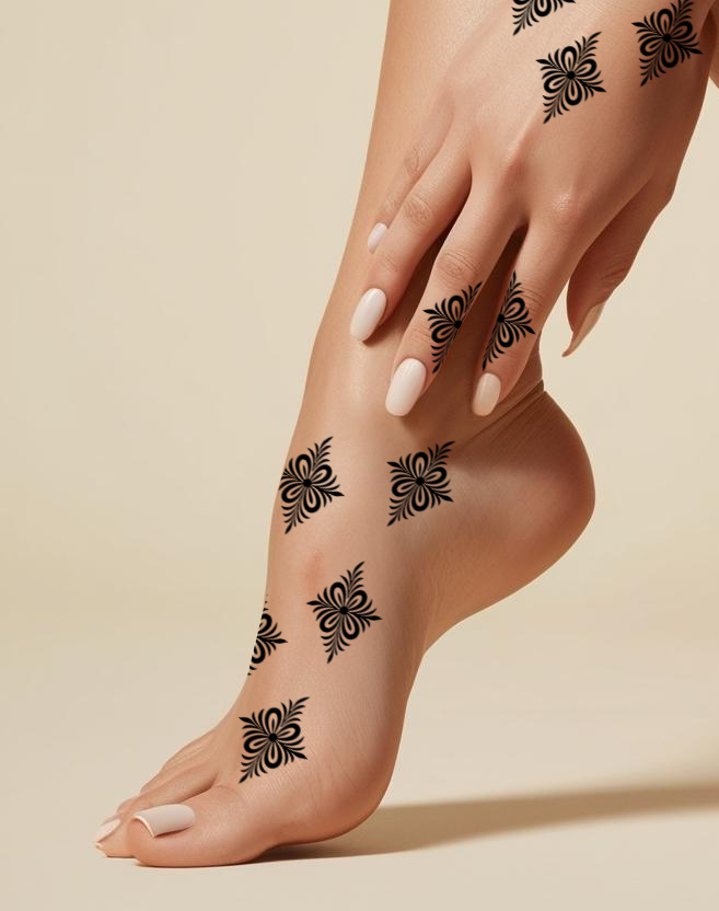 A timeless henna design featuring four elegant diamond-shaped floral motifs. Each bloom radiates with symmetrical curves and pointed tips, making it perfect for central hand placement or structured pattern work.