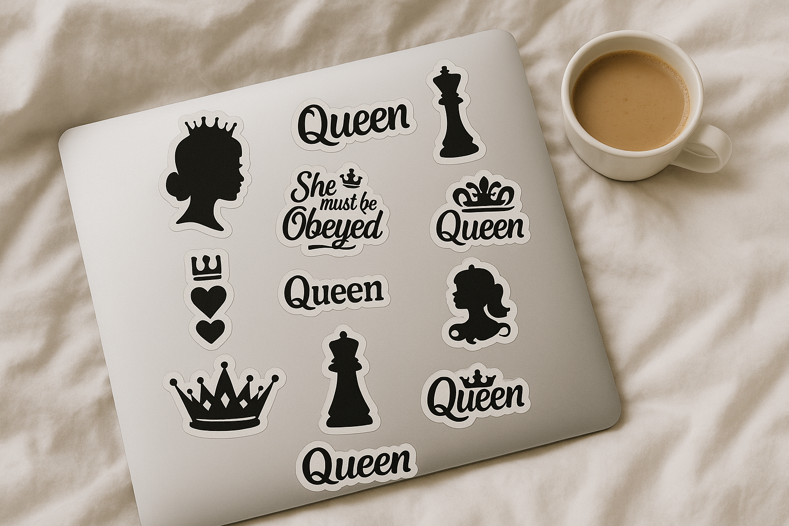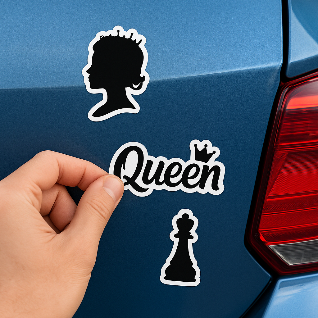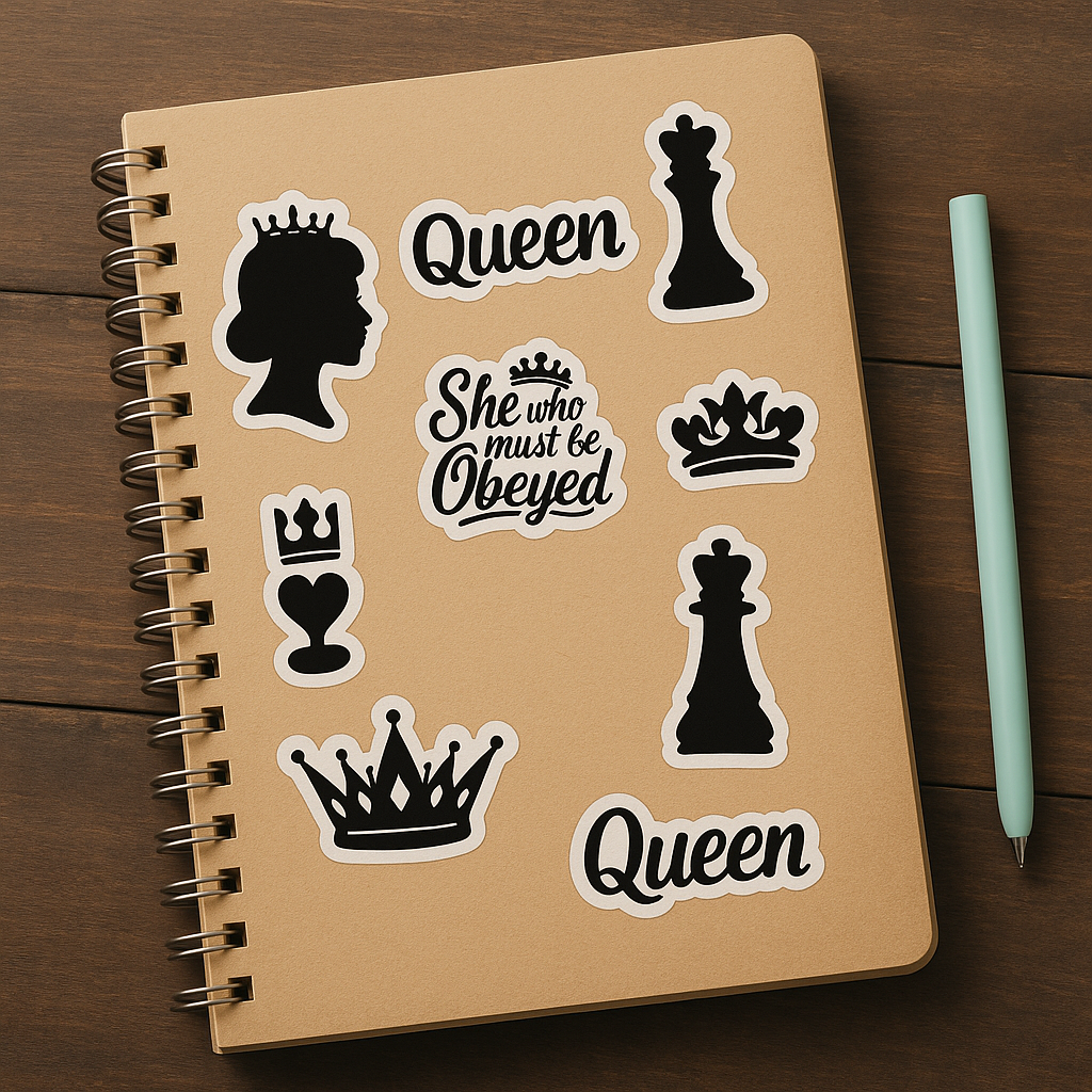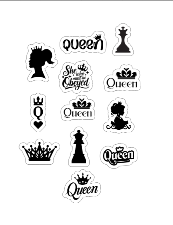 This A4 black-and-white vinyl sticker sheet features bold queen-themed designs, perfect for customizing laptops, notebooks, water bottles, and more. Made with waterproof material for long-lasting use.