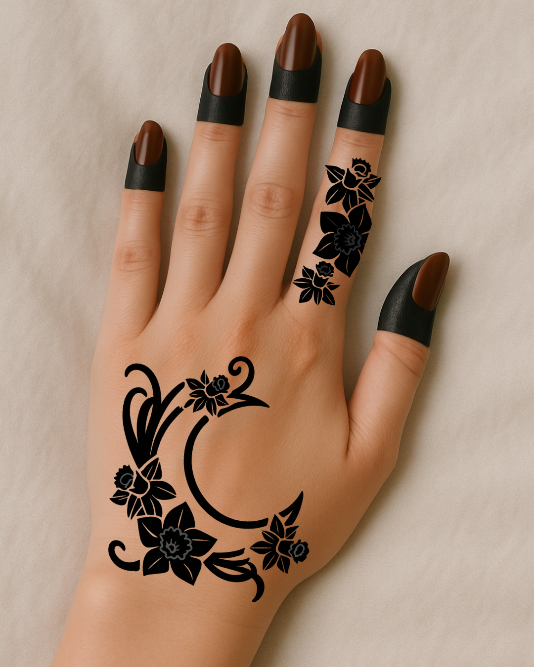 Ramadan Bloom Crescent — a mix-and-match floral crescent and flower henna stencil collection. features a beautifully detailed floral crescent moon paired with coordinating flower motifs in multiple sizes. Designed for flexible placement on the back of the hand and fingers, this set allows you to create custom henna looks ranging from bold statement designs to delicate accents. Perfect for Ramadan, Eid, and festive occasions, with clean lines ideal for stencils, temporary tattoos, and body art.