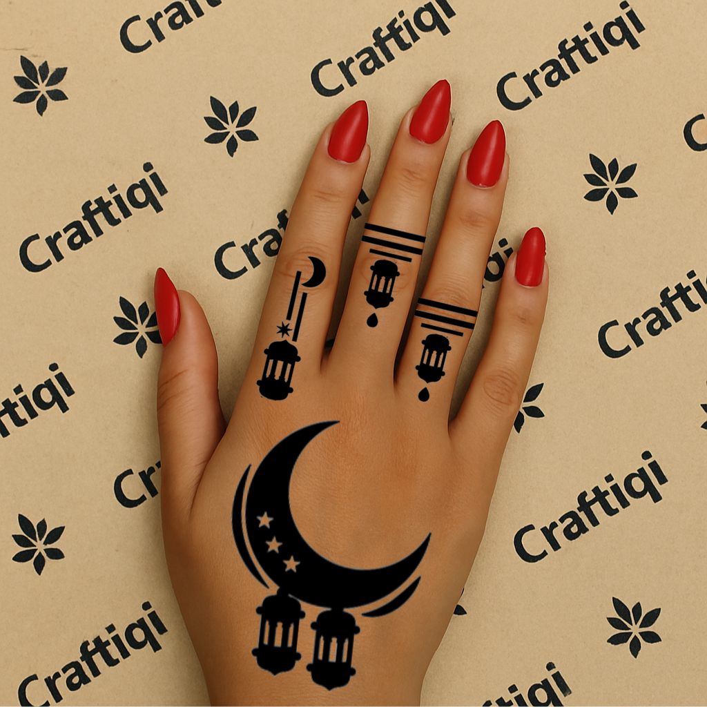 This modern yet traditional hand design is ideal for Ramadan, Eid celebrations, and festive occasions. Designed to sit beautifully on the back of the hand with clean lines and balanced placement.
