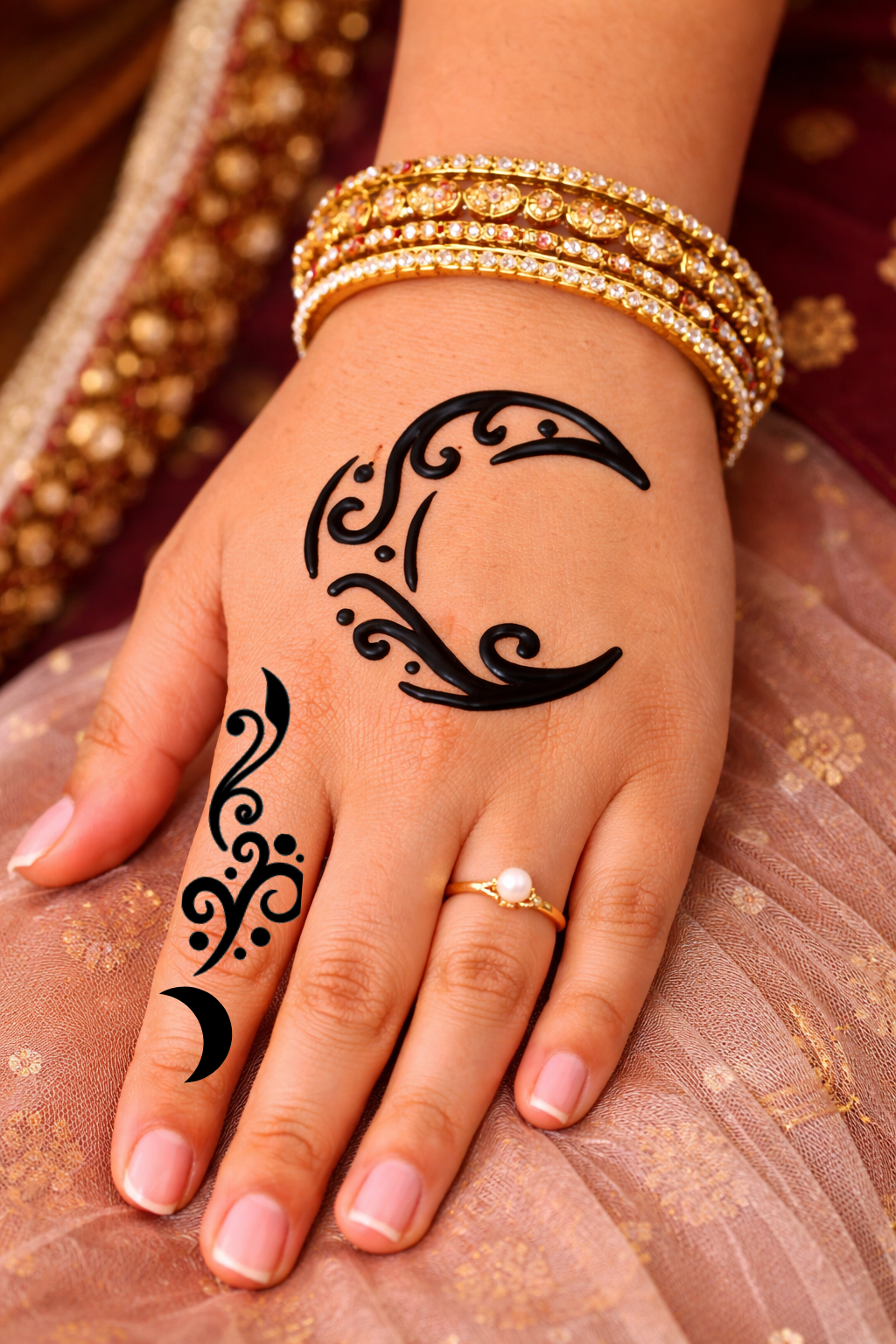 Swirl is a minimal yet graceful henna design featuring a soft crescent shape formed with flowing ornamental lines, paired with a delicate finger motif. Designed for the back of the hand, this piece balances traditional symbolism with modern elegance, making it suitable for Ramadan, Eid, and everyday festive wear. Clean curves and bold lines ensure a refined, eye-catching finish.