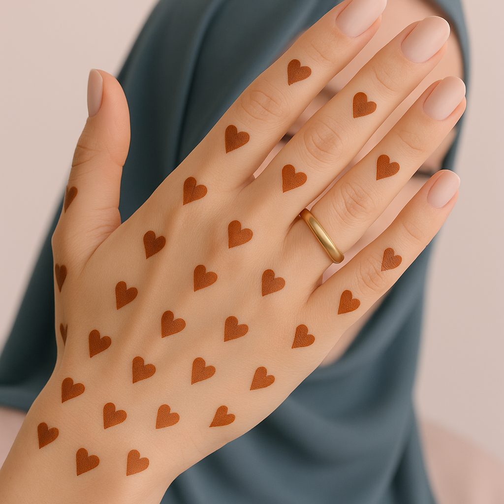 Sweetheart henna stencil featuring a pattern of evenly spaced hearts designed for the back of the hand. Ideal for romantic and festive occasions.